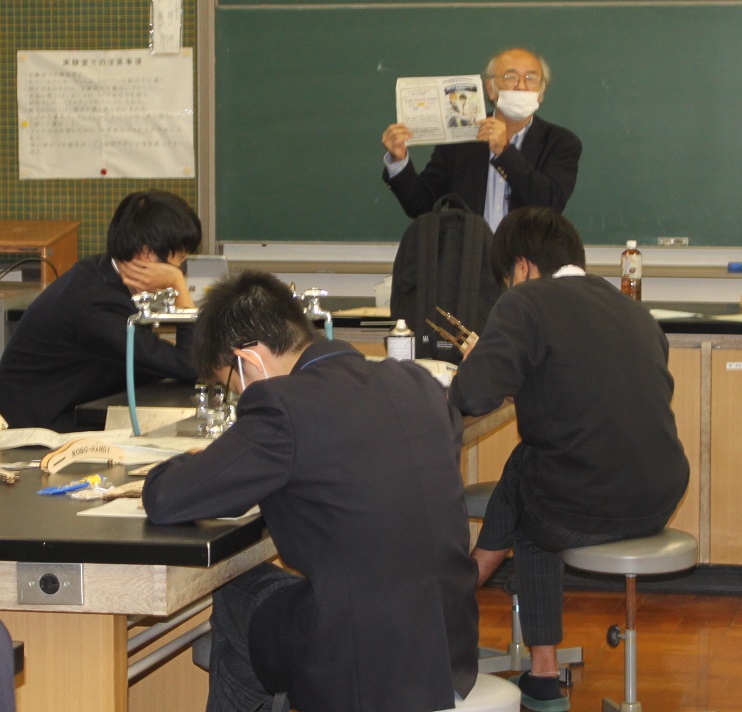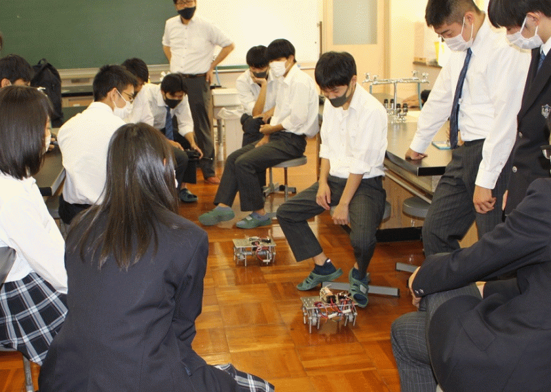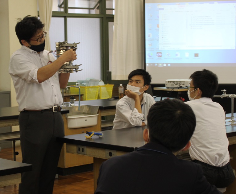 3年生ライフサイエンスの授業では、近畿職業能力開発大学校の先生にお越しいただき、「ロボットのつくりかた」と題したレクチャーをしていただきました。市販のモーター2個を使って先生の作られた、リモコンで動く8本足のロボットを、実際に動かさせていただきました。