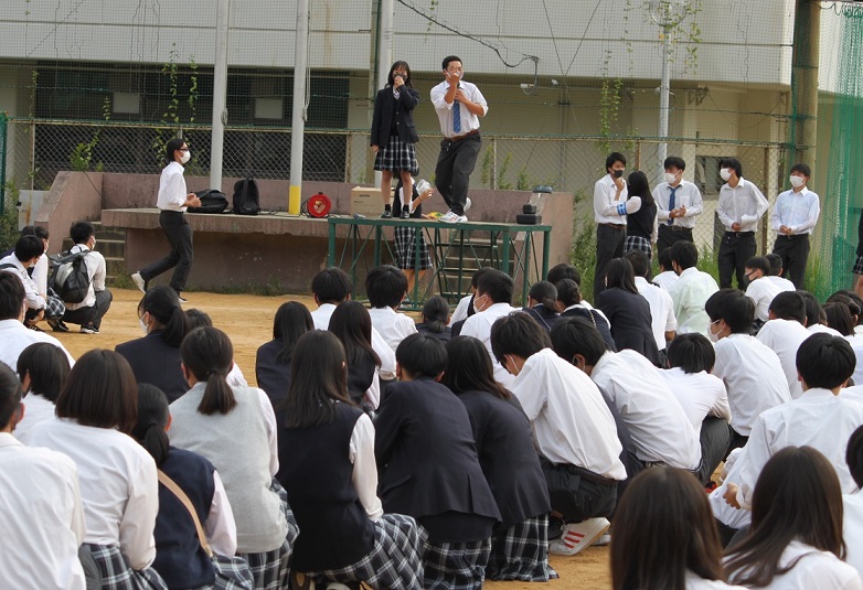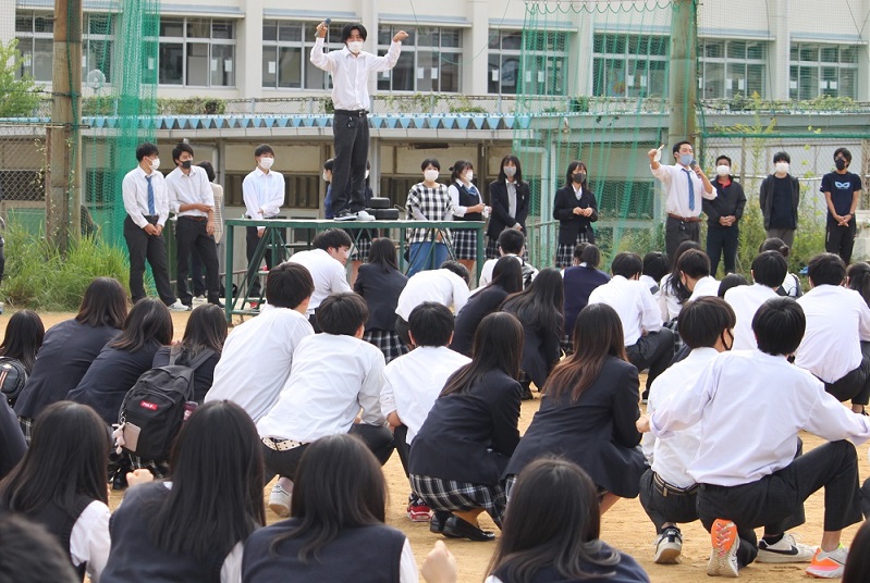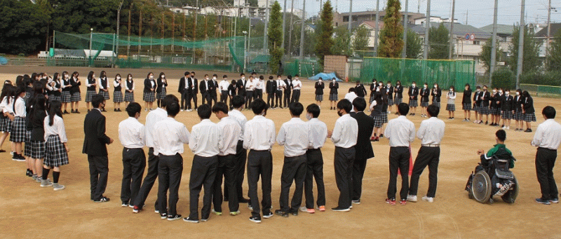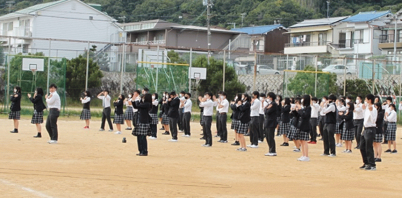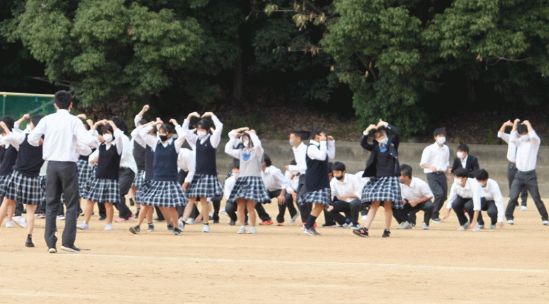 体育祭迄10日余りとなり、団の結団式を開催しました。密集を避けるために、2つのグループに分かれての開催となりました。いずれのグループも、最初に生徒会の体育委員長・副委員長から、体育祭に向けての意気込みを挨拶として話してくれました。続いて各団の団長から、自己紹介を兼ねたエールが語られました。堅さだけではなく笑いも入った和やかなものになりました。