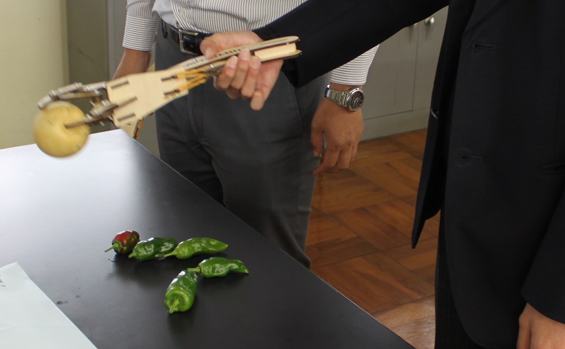大学校オリジナルのマジックハンドキッドを用意していただき、簡単な説明の後に、説明書に従って実際に組み立て作業に入りました。ドライバーでネジ占めをするだけの構造で、要素要所をボンド等で固定するだけです。出来上がれば早速、軟式のテニスボールや野菜をつまんでみました。簡単な割には精巧さでびっくりです。