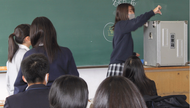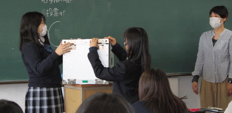 池田市選挙管理委員会からお借りした、本物の投票箱を生徒自らが組み立て、最初の投票者には、中に何も入っていないことも確認してもらってかた、個々人が投票をしました。リアルな題材や資材を通して、政治を身近に感じることができたようです。