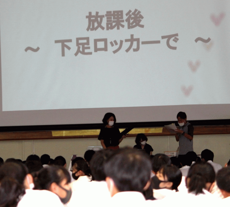 最初にクイズ形式で「セイ」に関する意識を確認したのち、担任団全員によるロールプレイで、日々の生活の中によくある状況を描き出しました。そうした状況の中には、男女の距離感や関係性が人権的に課題のある場面もあることを、共通認識として確認することができました。