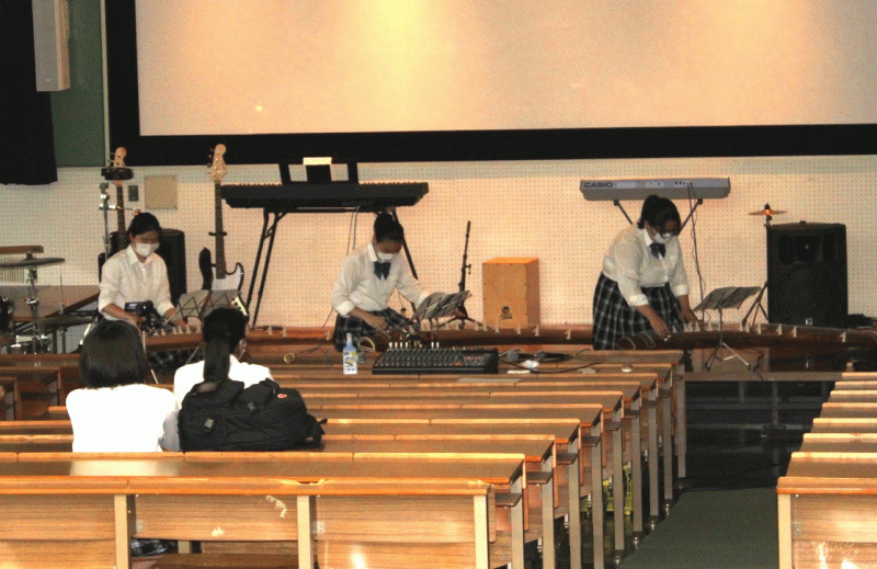 本校関係者が主催された演奏会の幕前に、十数分のお時間をいただきました。お客様を前にしては半年ぶりの演奏となり、また新入生にとっては初めての機会で、緊張もしたようですが、充実した時間となりました。