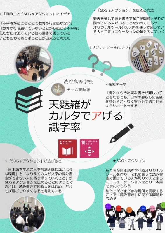 「天麩羅が カルタでアげる 識字率」というタイトルで、チーム・天麩羅はSDGsの「4.質の高い教育をみんなに」と「10.人や国の不平等をなくそう」への取り組みを行ってきました。身近にいる日本語の読み書きが難しい渡日生や海外にルーツのある子どもたちと、オリジナルカルタ「ことばふだ」を作って、一緒に楽しみながら日本語を学んだり、識字にまつわる問題を伝えたりと、1年生の秋から活動してきました。