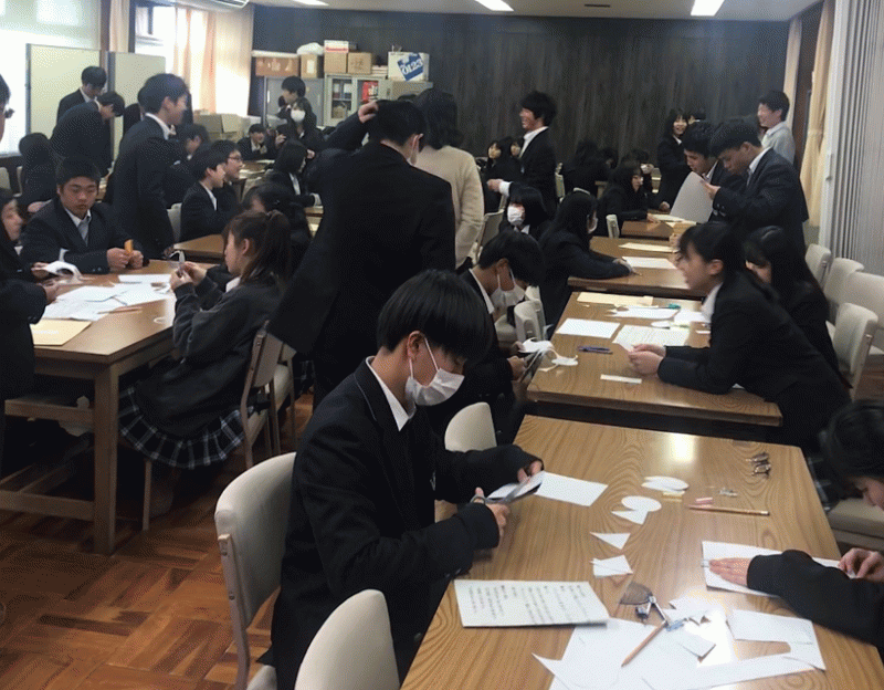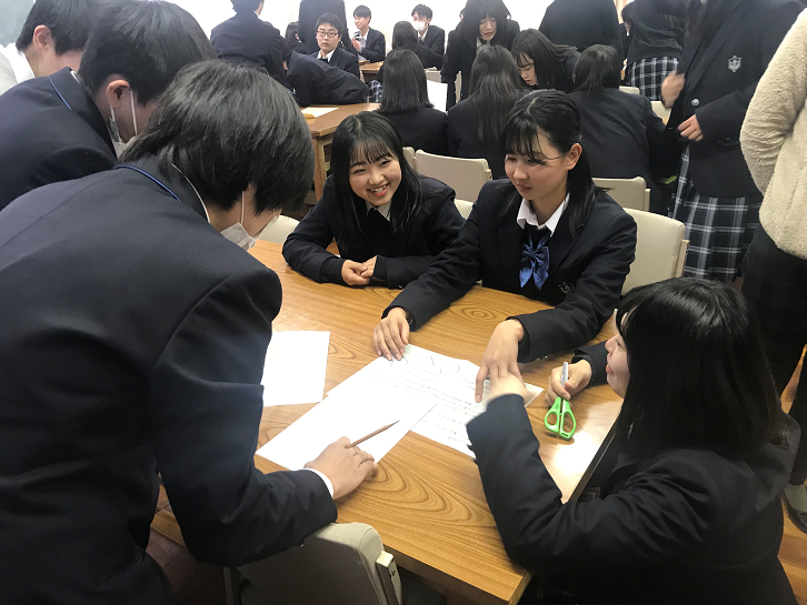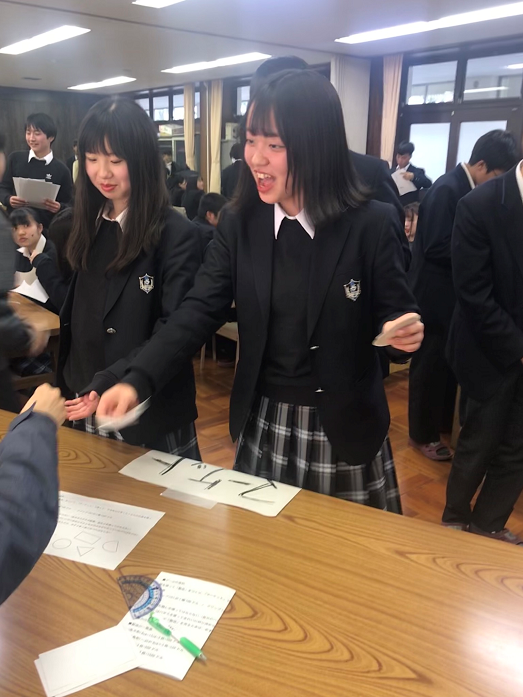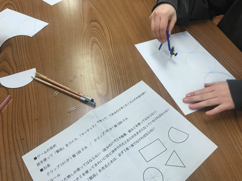 地理Aの授業で、ワークショップ「貿易ゲーム」を行いました。紙(資源)や道具(技術)を不平等に与えられた複数のグループ(国家)の間で、できるだけ多くの富を築くことを競う、貿易のシュミレーション・ゲームです。