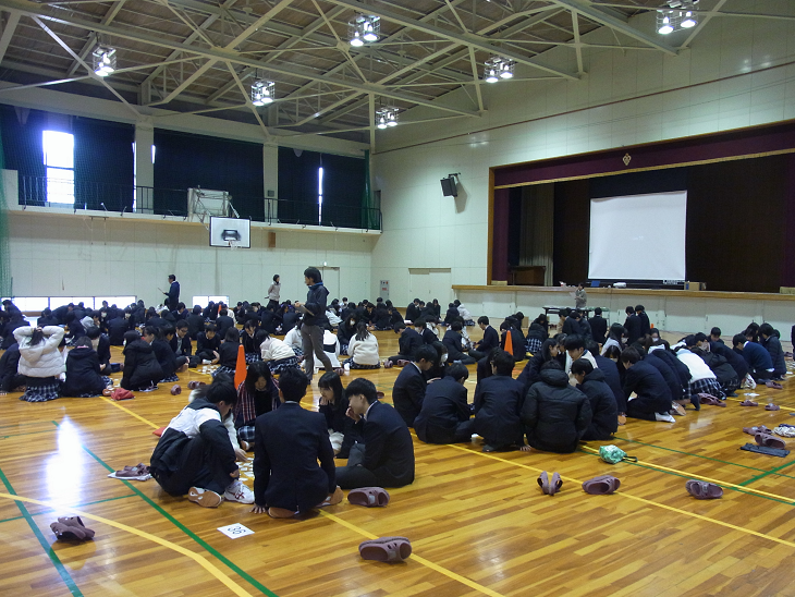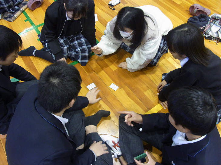 初めて顔を合わす生徒とも、かるたを通して交流することができ、とても盛り上がりのあるイベントになりました。また、最後の数枚に近づくと、体育館に静寂が訪れるほど真剣さの伺える場面もありました。