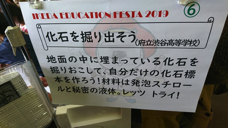 タイトルは「化石を掘り出そう」で子どもたちに大好評。長蛇の列ができ、教員3人だけではどうにもならず、課題研究発表チーム「天麩羅」と「SMILE(スミレ)」の生徒たちもたすけにまわりました。