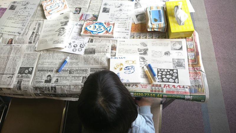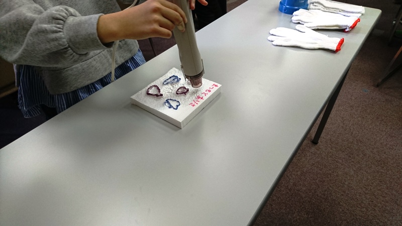 発砲スチロールとグリッドぺんを用いて、化石標本を作りました。原理は発砲スチロールを加熱し溶かし、グリッドペンの部分を浮き出させるというものです。