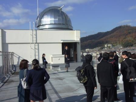 眺望のよい南館屋上です。正面に本校自慢の天文ドームが見えます。