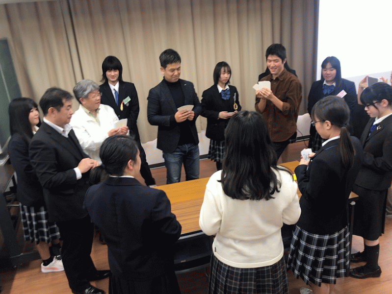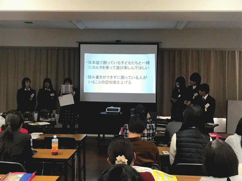 身近にいる日本語の読み書きが難しい渡日生や海外にルーツを持つ子どもたちが住みやすいまちにしたいという思いを伝える活動をしてきました。 それと並行して、おもしろくない日本語の勉強が少しでも楽しめるようなオリジナルカルタを作って交流してきました。 当日は、審査員の方々や出場した他高生にも一緒にカルタゲームを体験してもらいました。
