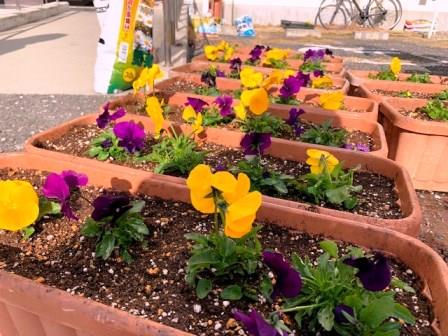 植え付けが終わったパンジーは正面玄関に飾られています。