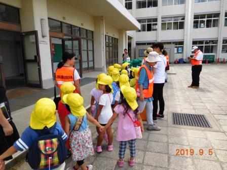 本校生徒の避難訓練は中止となりましたが、予定どおり地域の南畑公園自主防災会の皆様と、はたの保育園のさつきぐみ・さくらぐみの子どもたちおよび先生方には、避難訓練のため本校にお越しいただきました。