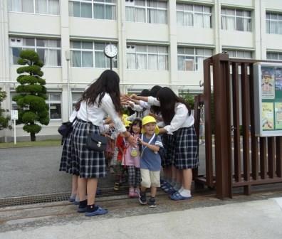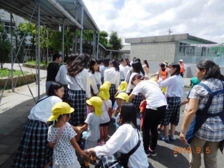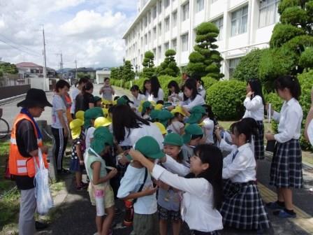 途中で本校3年生の「子どもの発達と保育」の授業を選択している生徒たちと合流し、安全な避難のために手をつないで学校敷地内を歩きました。