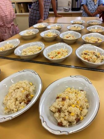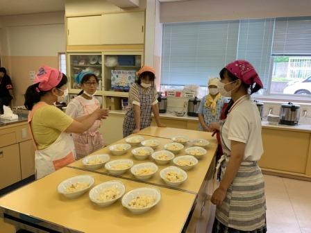 7月26日のメニューはピラフで、渋谷中学校PTAの皆さんや先生方に教えていただきながら、大量の調理を行いました。