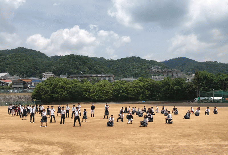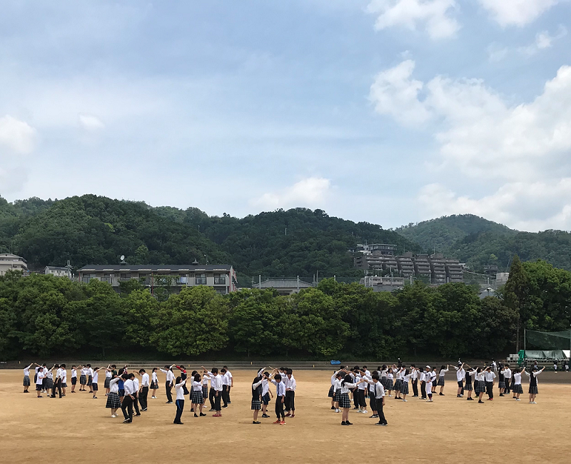 来週の体育祭に向けて、グラウンドで応援合戦のリハーサルを行いました。 団長を中心に3学年が、心をひとつに団のテーマに沿ってダンスをしています。