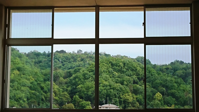 「私は北館校舎の廊下から、階段踊り場越しに眺める五月山の姿を気に入っています。