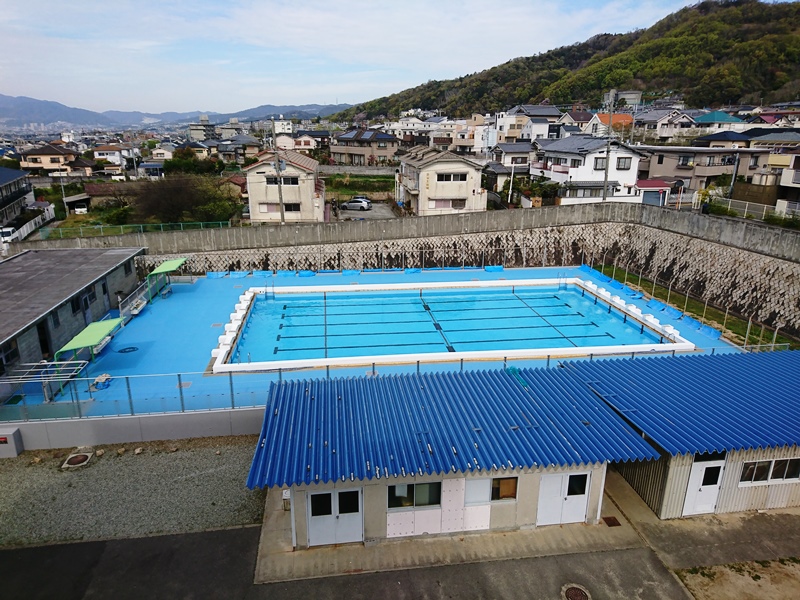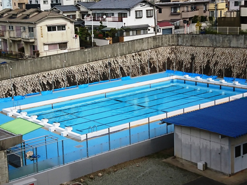 プールサイドは創立100周年記念事業ですでに昨年から青いシートが敷き詰められていました。