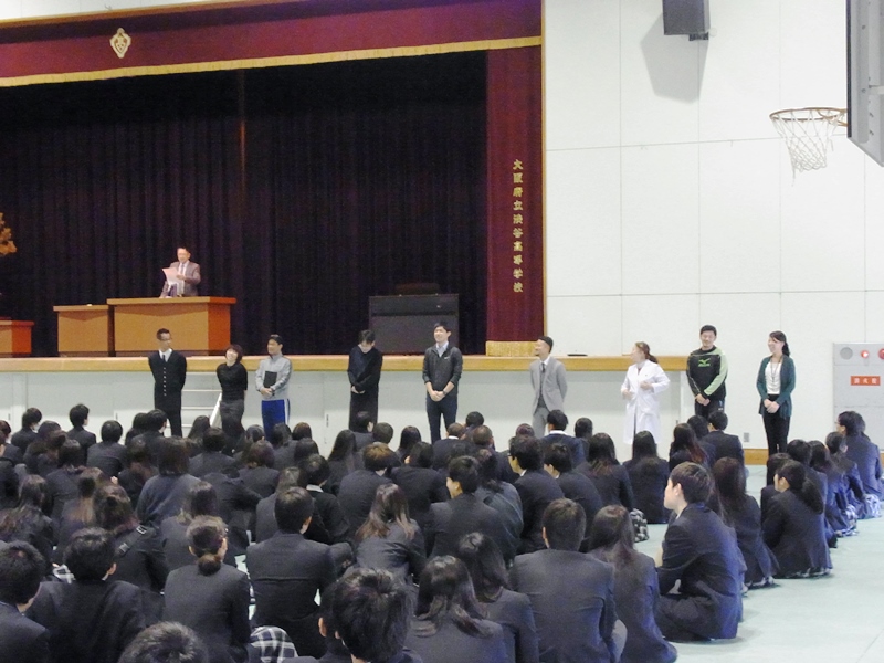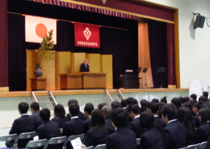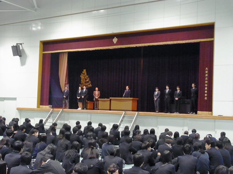 本日 ここに平成三十一年度入学式を挙行するに当たり、公私ご多用の中、大阪府教育委員会ご代表をはじめ、各方面からご来賓の皆様のご臨席を賜り、第七十四期生の栄えある入学に、一段と光彩を添えて頂きましたことを、高い所からではございますが、厚くお礼申し上げます。