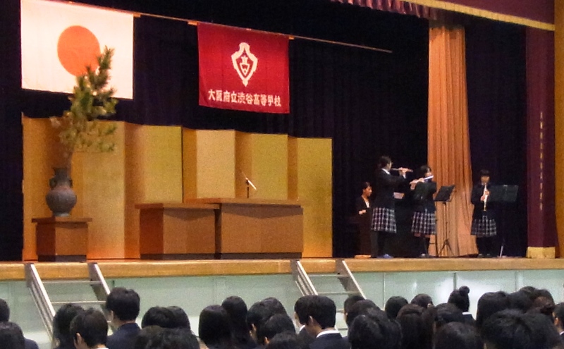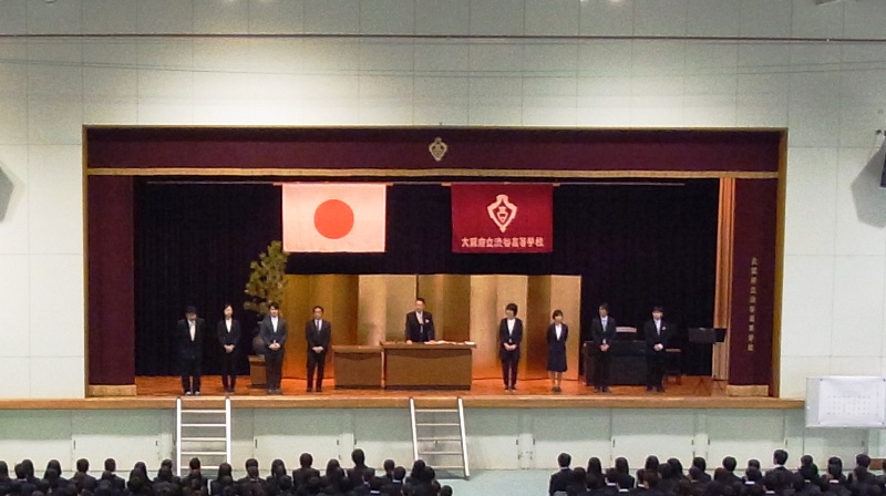 本校は、1917年、池田町室町に手芸女学校として開校いたしました。その後、池田市立渋谷高等学校時代を経て、昭和五十年、大阪府に移管され、大阪府立渋谷高等学校となり、本年で創立百二年となる池田の伝統・名門校です。これまで、社会に有為な人材を数多く輩出してまいりました。そして、本日、ここに、新たに第七十四期生を迎えることができ、教職員・生徒一同、たいへん嬉しく感じております。