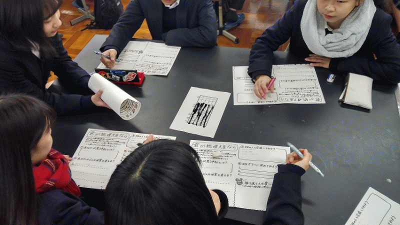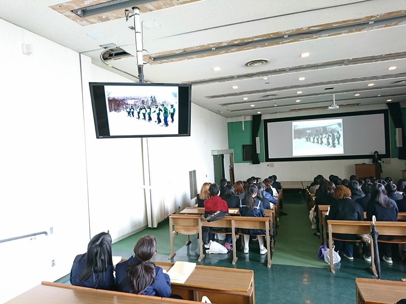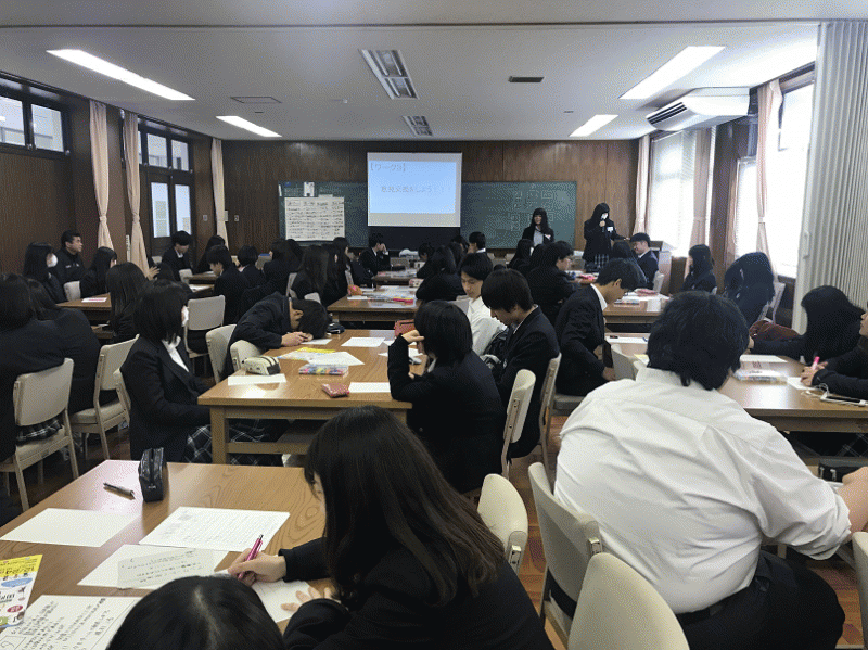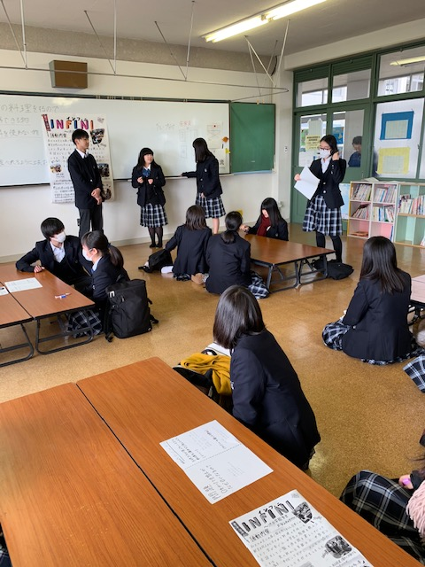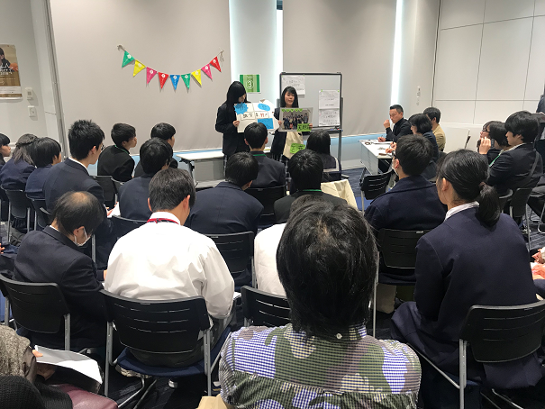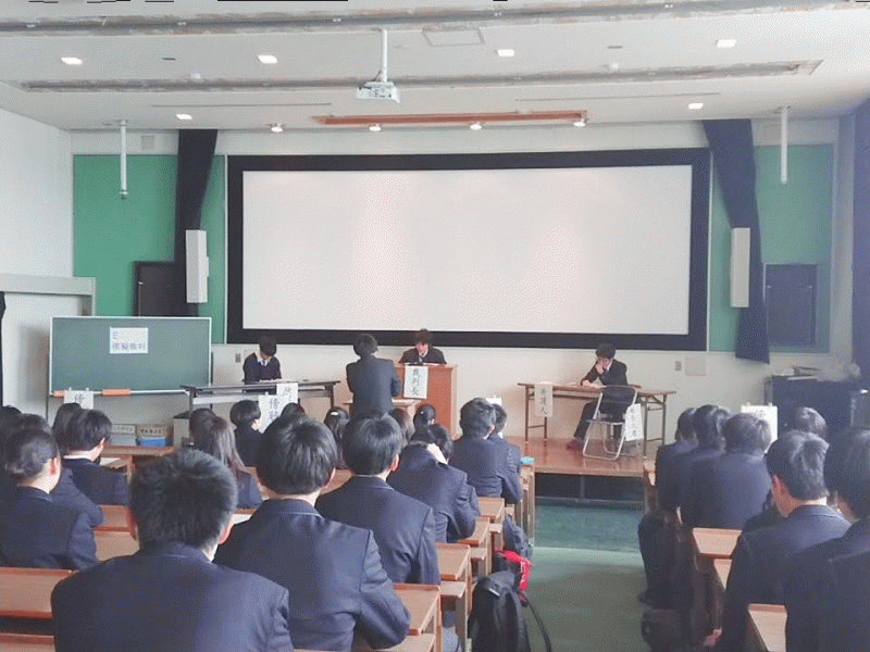 1年生はG−PROの優秀班3つがプレゼンをし、2年生は1年間の取り組みをスライドで紹介し、3年生は3年間を振り返って成果を発表しました。 前で発表する生徒に注目し、みんな集中して聞いていました。
