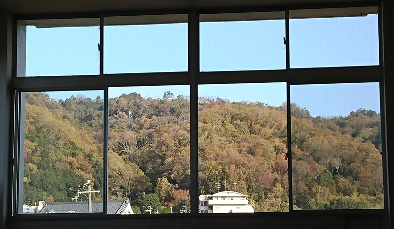 「私は北館校舎の廊下から、階段踊り場越しに眺める五月山の姿を気に入っています。