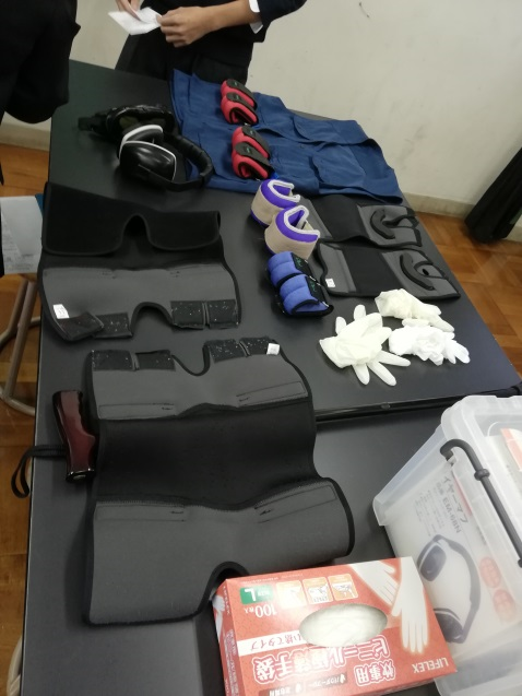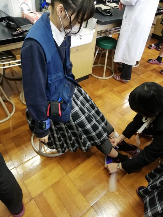 からだや手足におもりをつけたり、特別なゴーグルやイヤホンをして視力と聴力を下げたりして高齢者に近い状態を体験しました。