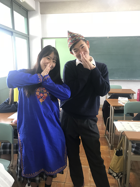 写真はネパールの衣装です。 JICAの職員の方や他校の先生も授業見学に来られ、生徒たちは来校者とも意見を交わしていました。