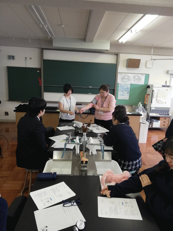 今日のテーマは「生命の証」です。生きていると判断するにはどうすればいいのでしょうか。医学的な知見から学びました。実習では、バイタルサインの血圧・脈拍の測定をしました。看護師さんたちはどうやって血圧を調べているのかの疑問が解き明かされました。