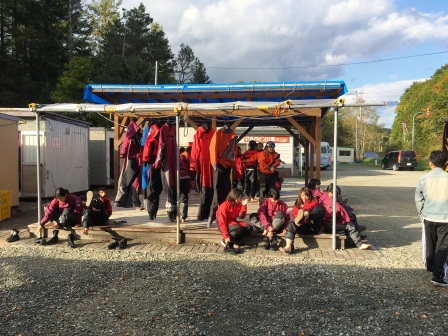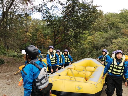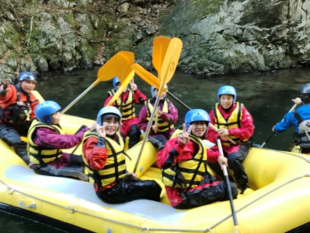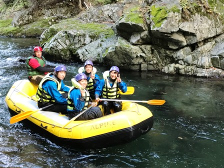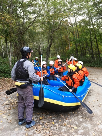 ラフティング(5〜8組)の様子です。インストラクターはとても面白い人がたくさんいました。外国人や女性の方もいました。ラフティングをするには準備がいろいろあります。ドライスーツ・ライフジャケット・ヘルメットを着けた後、パドルの漕ぎ方や立て方、ボートでのシットポジションや体重移動、そして激流にさしかかったらすばやくエンドウ豆のようにボートに深く座る必要があるなど、安全のために大切なことをしっかりと、でも楽しく学んで出発します。