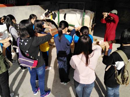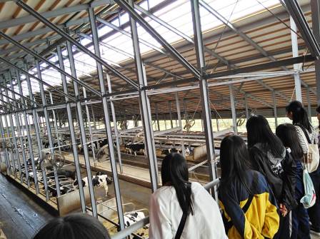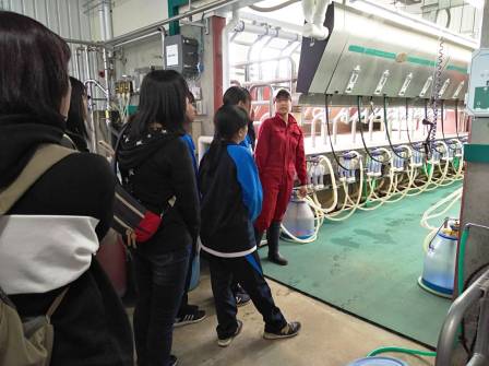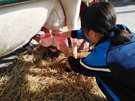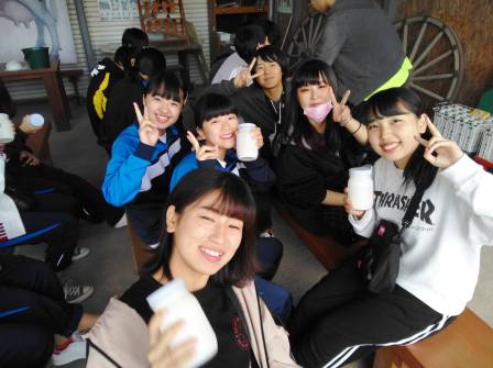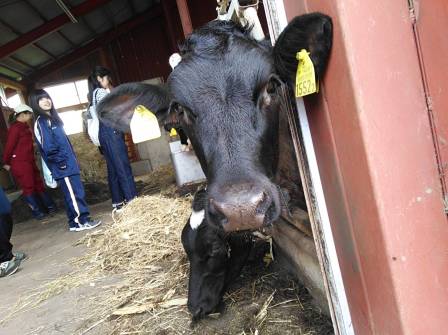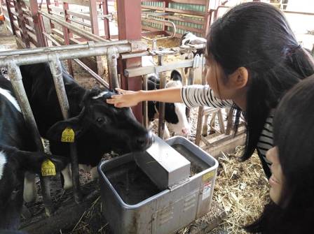 牛の搾乳・バター作り(1〜4組)です。愛情をもって搾乳しますが、繊細な技術が必要で、難しいです。牛の瞳はとてもつぶらです。自分で作るバターの味は格別です。