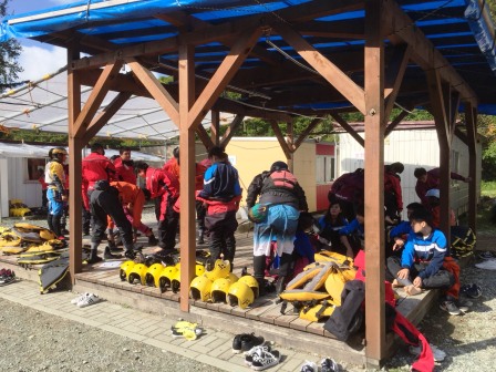 ラフティング(1〜4組)の様子です。場所はホテルから場所で30分ほどのところにある空知川(そらちがわ)です。水しぶきを浴びますのでドライスーツを着用します。また安全のためにライフジャケットとヘルメットも付けます。