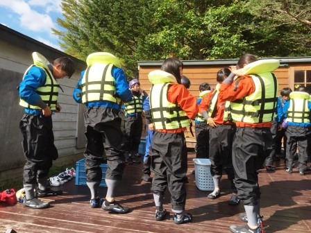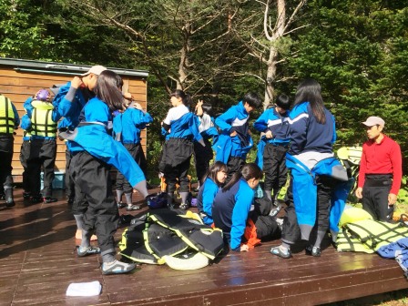 修学旅行3日めです。本日はラフティングと選択体験の日です。朝の気温は8℃でした。天気は曇りですが、時折晴れ間ものぞいています。