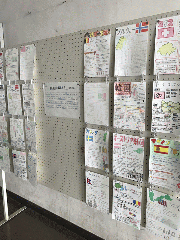 旅行雑誌の編集者になったつもりで、 1つの国を選んで、各自そのPRをする課題を行いました。 現在、各クラスの優秀作品を廊下に掲示しています。