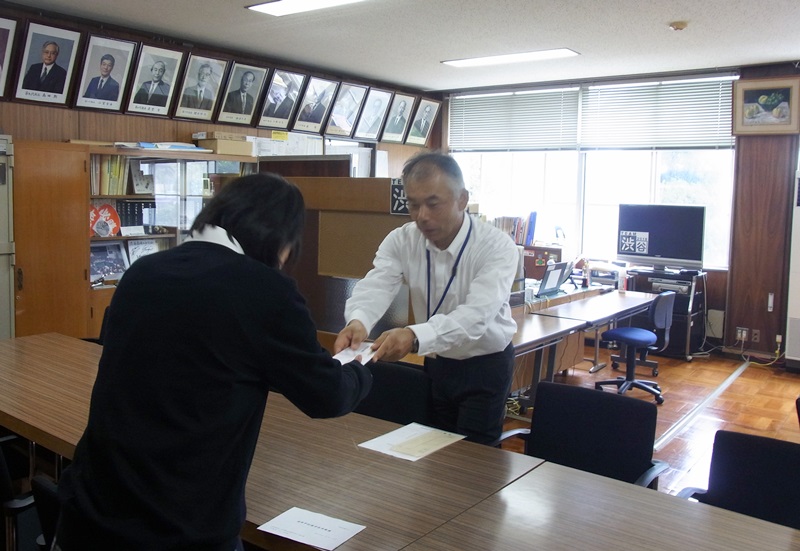 校長室で日本教育弘済会大阪支部事業推進部長 古谷知一様から、校長・教頭・学年主任・担任が見守る中、直接生徒本人に奨学金が手渡されました。