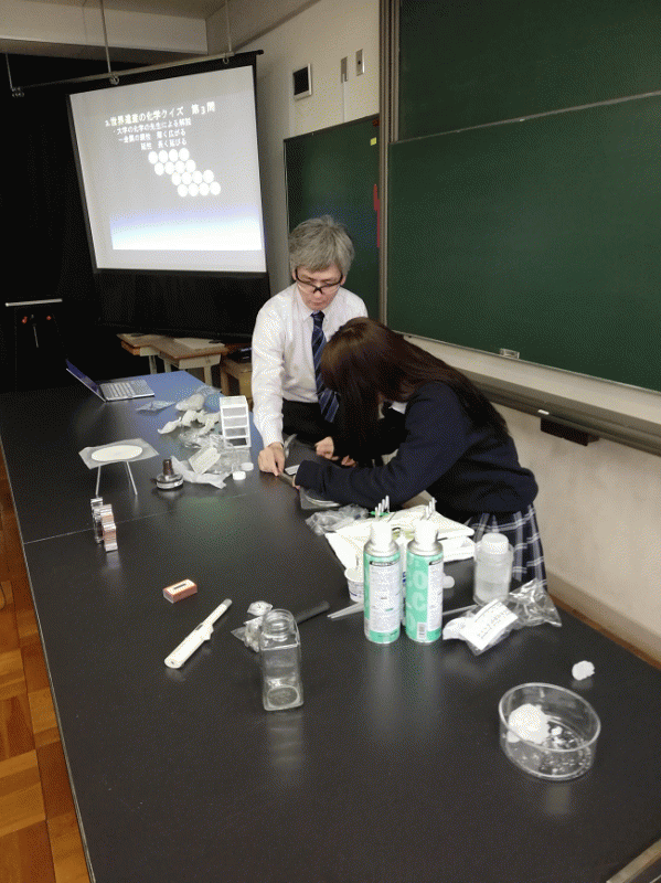 例えば、「自由の女神は、完成直後は何色だったのか」。実は、銅でできているため、もともとは10円玉と同じ色だったのです。中学でも習う酸化などの反応によって、現在の色になったそうです。また、話だけでなく、実際に体験することができました。
