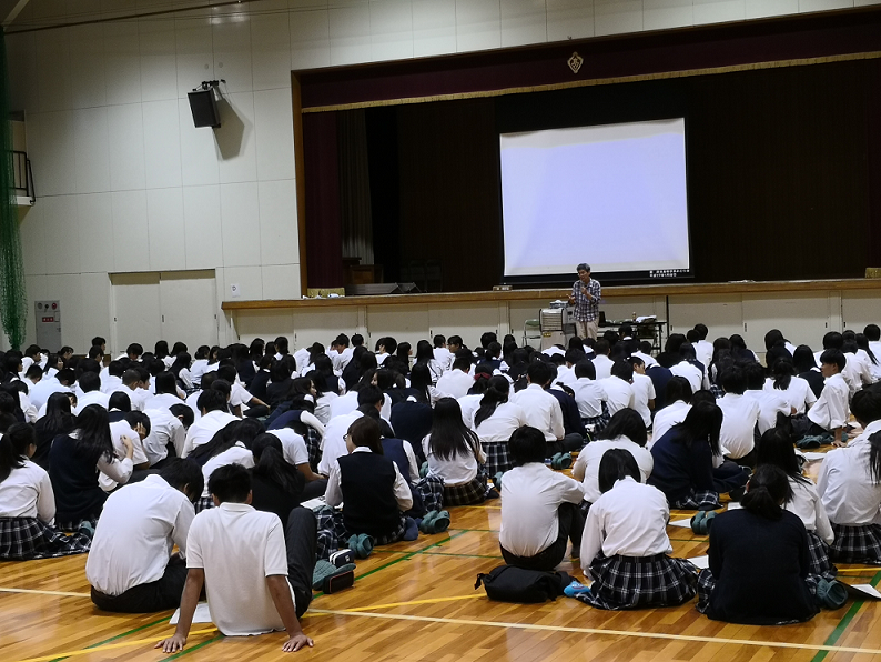 ホームレスの人数の推移や経済状況,それに対するボランティア活動の様子など,内容は多岐に渡りました。2時間という長い時間の講演でしたが,73期の生徒たちはしっかりと話を聞くことができたようで,特に映像で見た子どもたちのボランティア活動(ホームレスの見回り活動)に興味をもったようでした。