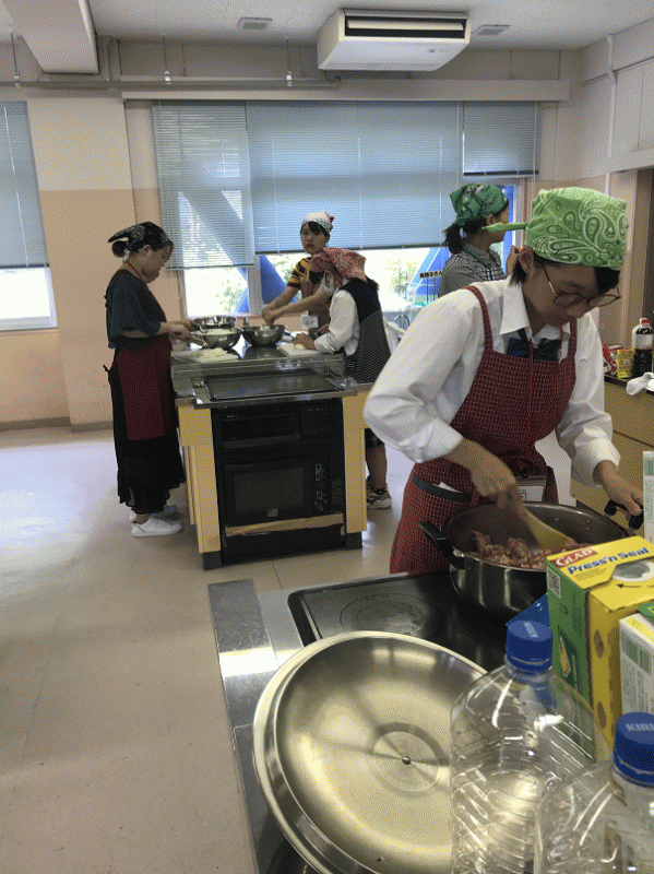 この日のメニューは豚丼で、周りの大人スタッフの方に支えられながら、70人分の調理を行いました。 小中学生と関わって、いろんな刺激を受けながら、活動を楽しんでいます。