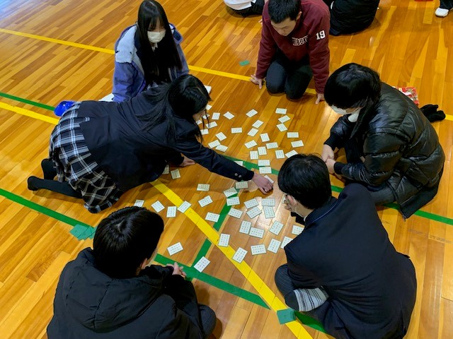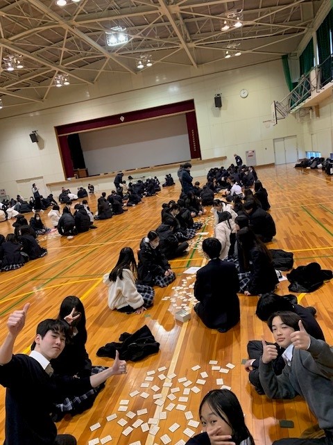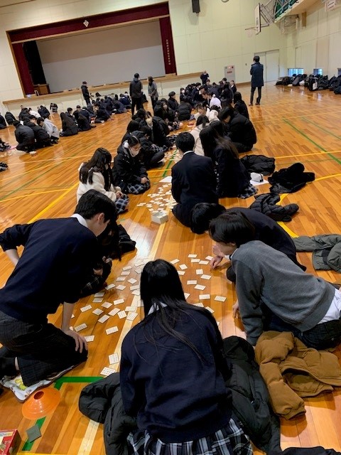 担任団の先生が順番に札を読みはじめると、円形に札を囲んで座っている生徒たちが一気に札をとりあいます!1年生のみんなは、楽しみながらも集中して百人一首に取り組んでいました。