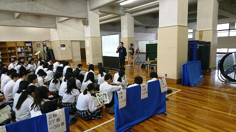 地震により体育館2階が被害を受け、まったく使用できないため、柔剣道場で4クラス毎2回に分けて行いました。