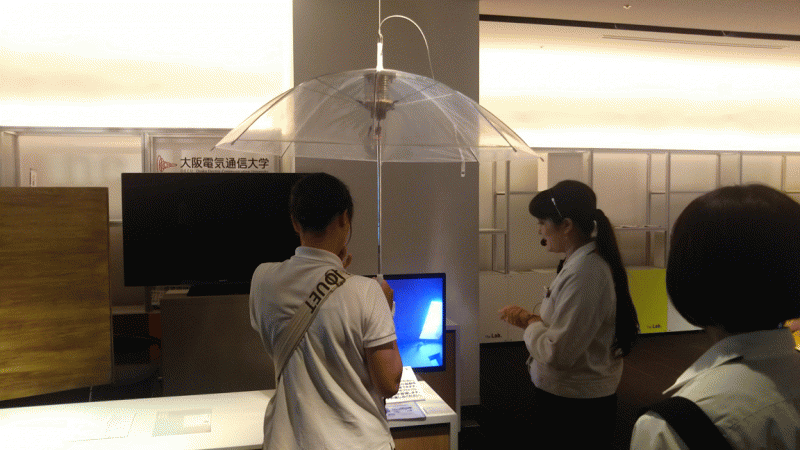 展示の中には、ARやAIを用いて、さまざまな服を着る体験ができる技術など、実用的なものもあれば、 異なる場所でおきた振動を、離れた場所で感じることができる傘など、用途がまだ定まっていないものもありました。