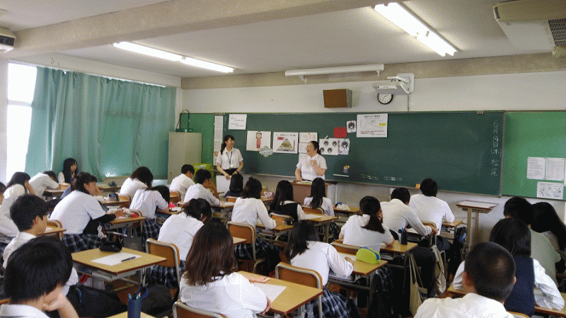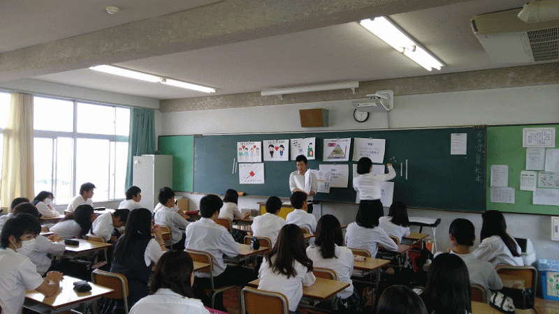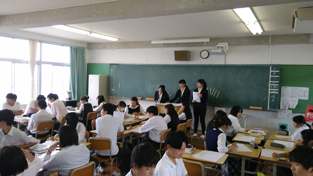 2名または3名の学生が各クラスで、それぞれが考えた健康教育を展開してくれました。年齢の近い者が伝えることによって、より理解がすすむことを期待している事業です。高校生が理解しやすいような工夫がたくさんあり、本校生にとって、有意義な時間でした。