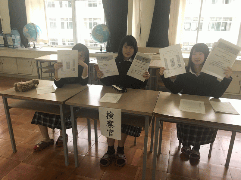 生徒たちはシナリオをもとに配役になりきって演技します。 裁判官・裁判員が廊下で評議を行い、判決を決定します。 クラスによって有罪無罪が変わることもあり、生徒たちは真剣に授業に取り組んでいます。