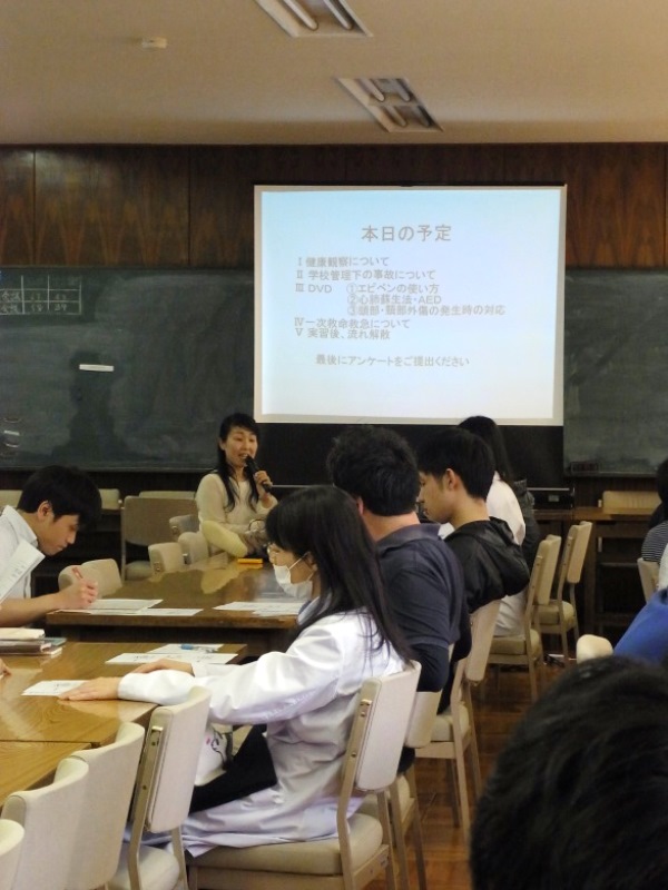 今年度は、本校保健主事による学校安全に関する講話と 一次救命救急についての実習、エピペントレーナーを使用した実習を行いました。