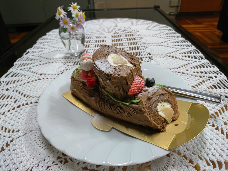 ご覧のように木の切り株を模したロールケーキの上にサンタがのったかわいいケーキができあがりました。