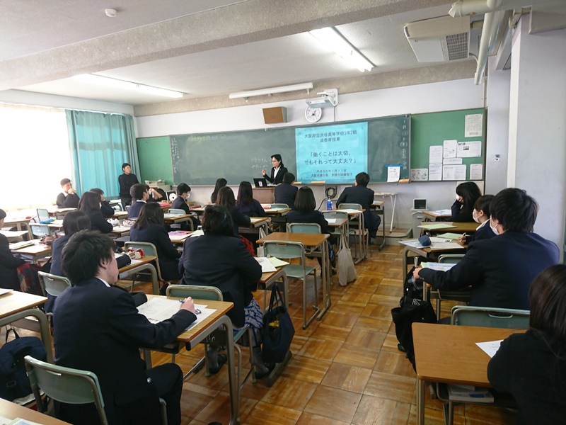 1/11(木)3年生の総合的な学習の時間で、「社会に出るための法律講座」と題して、大阪弁護士会より弁護士さん8名を各クラスにお招きして、特別授業をしていただきました。