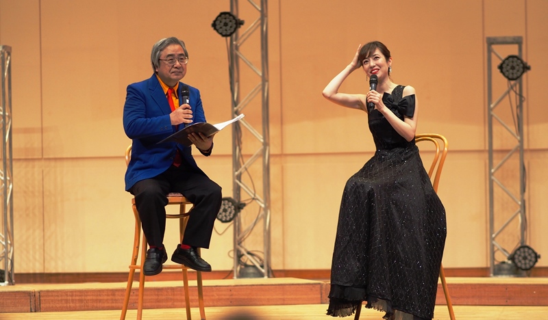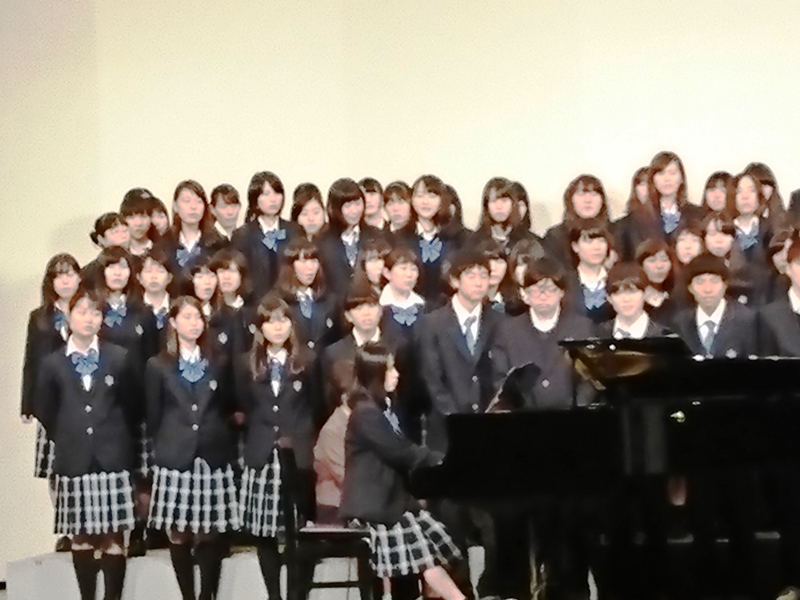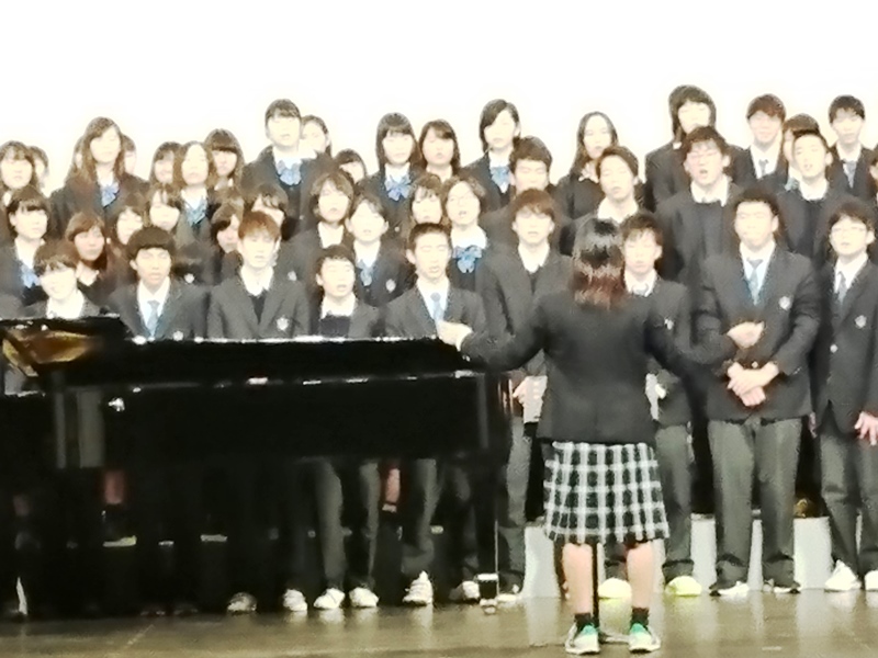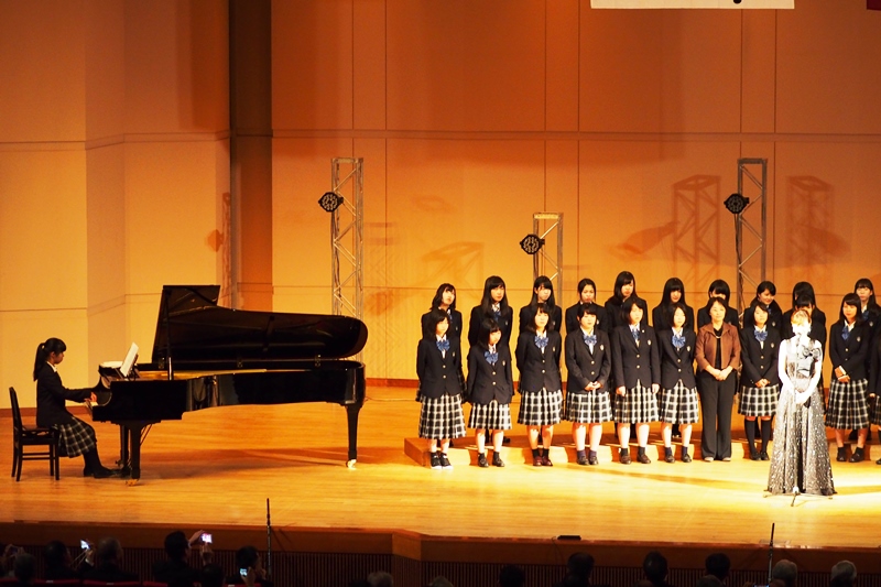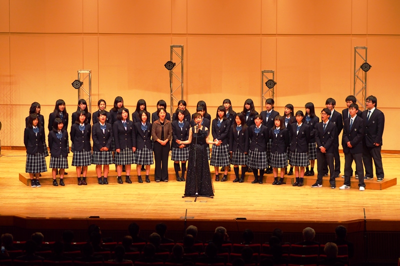 特に2曲目はこの日のためにプロによりアレンジされた創立100周年バージョンの本校校歌で、大鳥さんのソロを中心とした本校生とのコラボが会場の人々の気持ちを引きつけ、創立100周年記念式典にふさわしいとりを飾っていただきました。