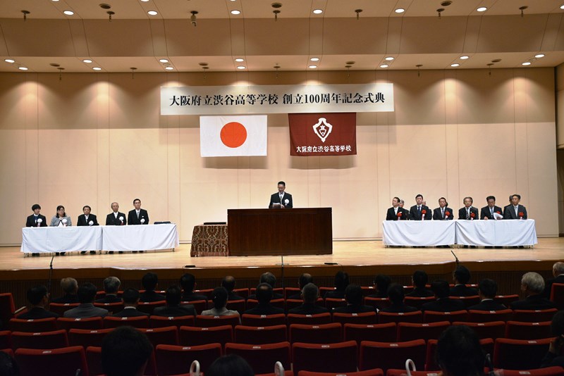 本日 ここに大阪府立渋谷高等学校創立百周年記念式典を挙行するに当たり、公私ご多用の中、大阪府教育委員会ご代表 大阪府教育庁教育監 橋本光能 様、大阪府議会議員 原田こうじ 様、池田市長 倉田 薫 様をはじめ、各方面から多数のご来賓の皆様並びに本校ゆかりの、PTA、緑友会、みどり会、後援会、旧職員といった関係者の皆様とともに本校の創立百周年をお祝いできますことは、生徒並びに本校職員一同、心から喜びに存じております。厚くお礼申し上げます。