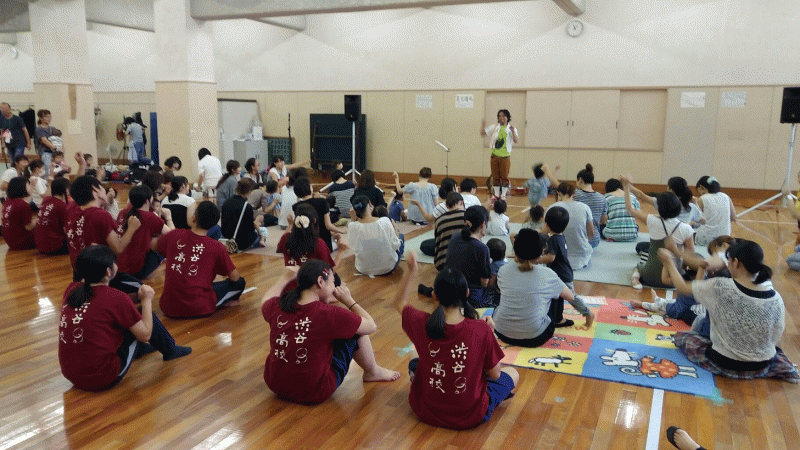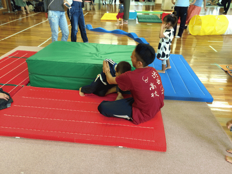池田市の子育て支援推進会議「ラ・クーダ」主催のイベントが、9月13日(火)10時から12時まで、本校柔剣道場で行われました。当日は、本校3年生の「発達と保育」の授業選択者13名を交えて、地域の親子連れの方々約30組を迎えることとなりました。第1部では、おもちゃあそびができるスペースを4箇所設け、こどもたちがスタッフや渋高生とともに楽しそうにあそんでいました。また、第2部では、あそび歌作家の方により、手遊びや歌など様々なあそびを紹介していただきました。親子でコミュニケーションをとることができ、参加したこどもの笑い声が場内に響いていました.。
