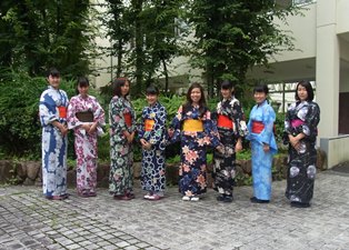 7月12日に「ゆかた着付け教室」を行いました。きもの着付け桃山学院より多くの先生方にお越しいただき、生徒7人と英語講師1人が参加しました。1時間ほど指導していただいて、「ゆかた」を美しく着ることができるようになりました。