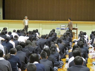 5時間目は、体育館の全体講演として、俳優として活躍されている稲森誠さんと多田志典さんから、演劇要素を盛り込みながら、稲森さんが仕事とどう向き合ってこられたかを熱く語っていただきました。
