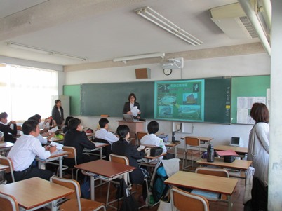 左は、建設業について、プロジェクタを使いながら、お話をいただいているところです。